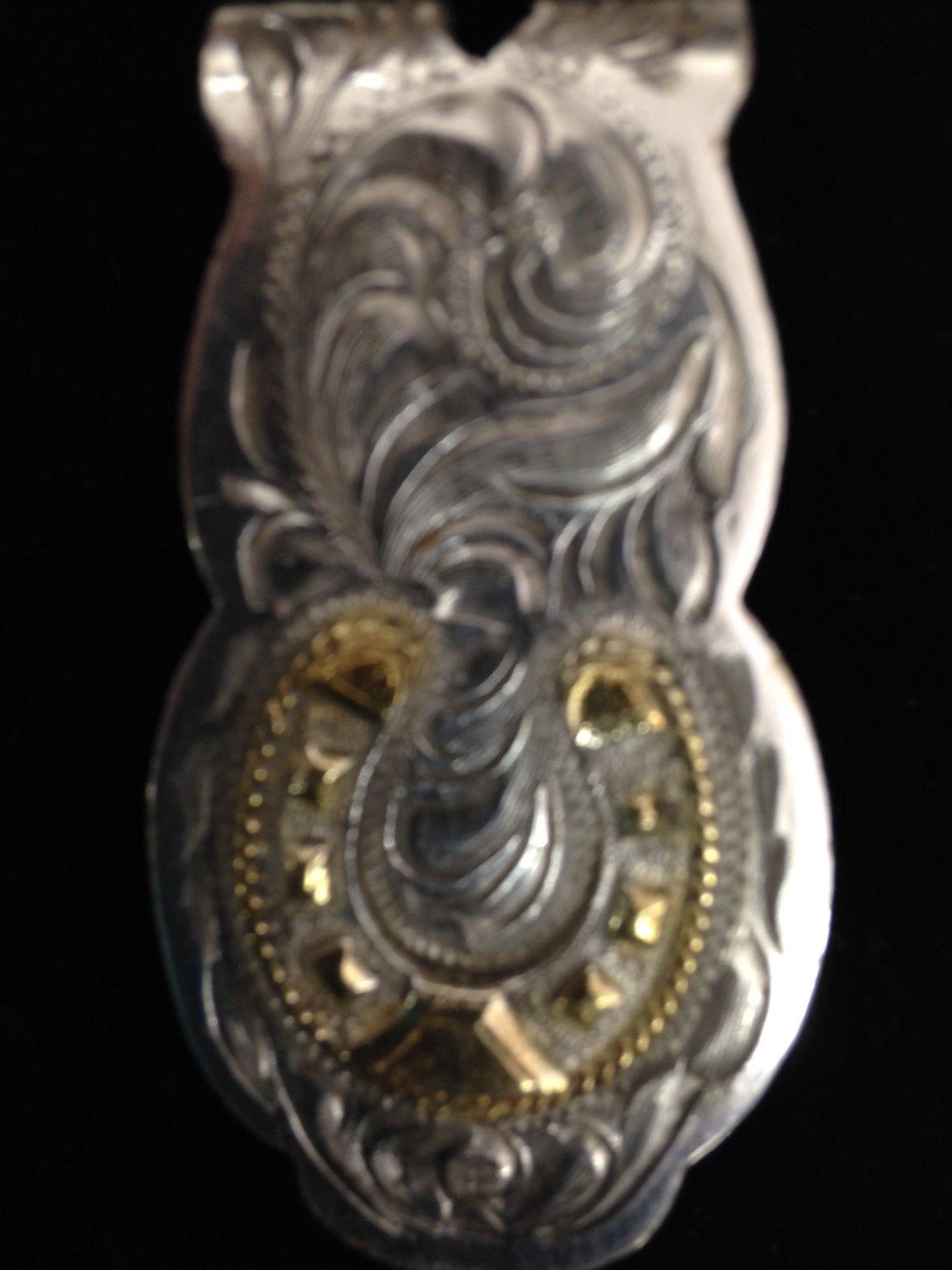 Beautiful sterling silver money clip fully engraved and has a gold horseshow on front.