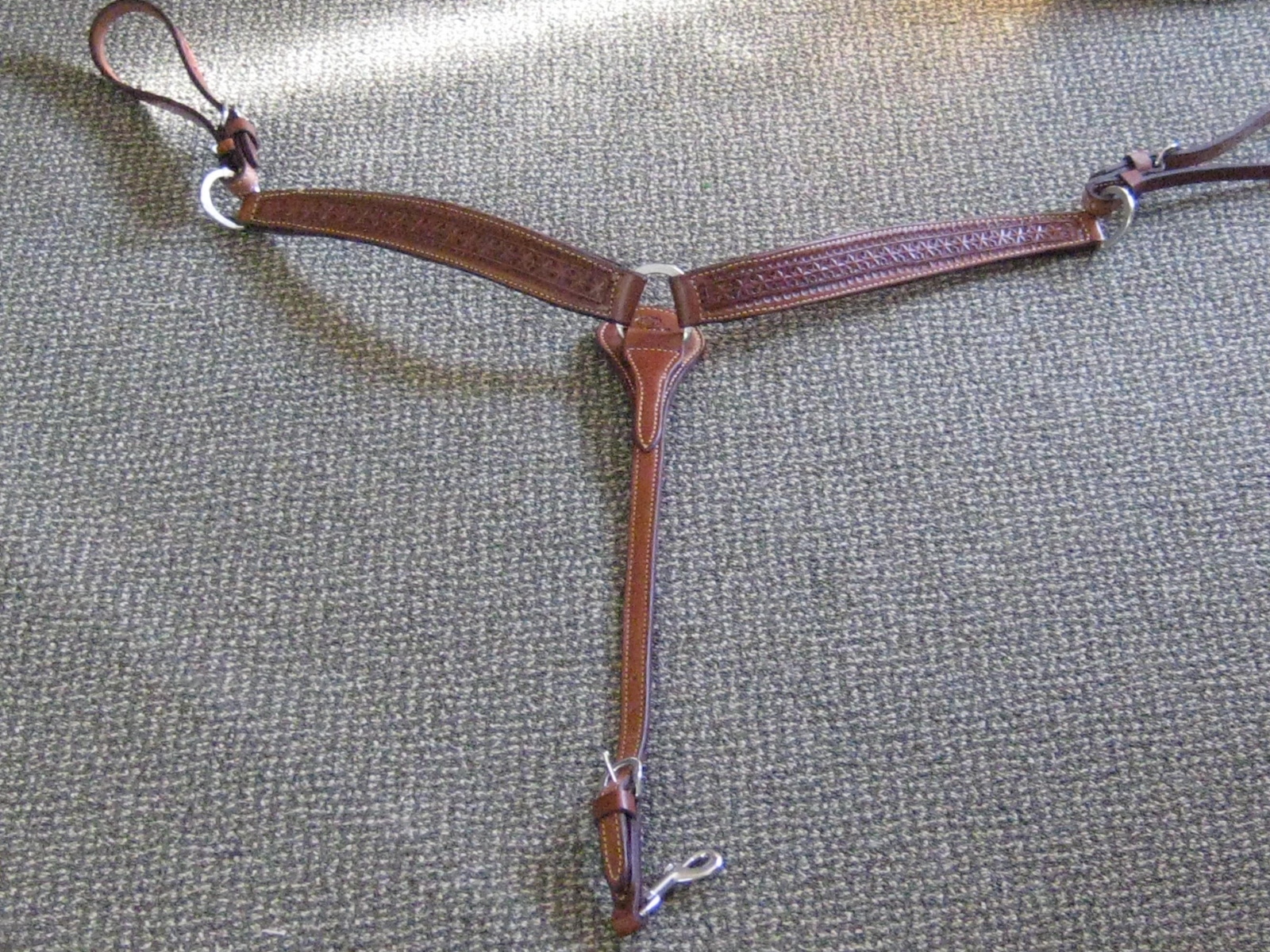 This Billy Cook breast collar is made of thick 2" wide doubled and stitched leather for extra durability. The surface is tooled with a star design and features nickel hardware.