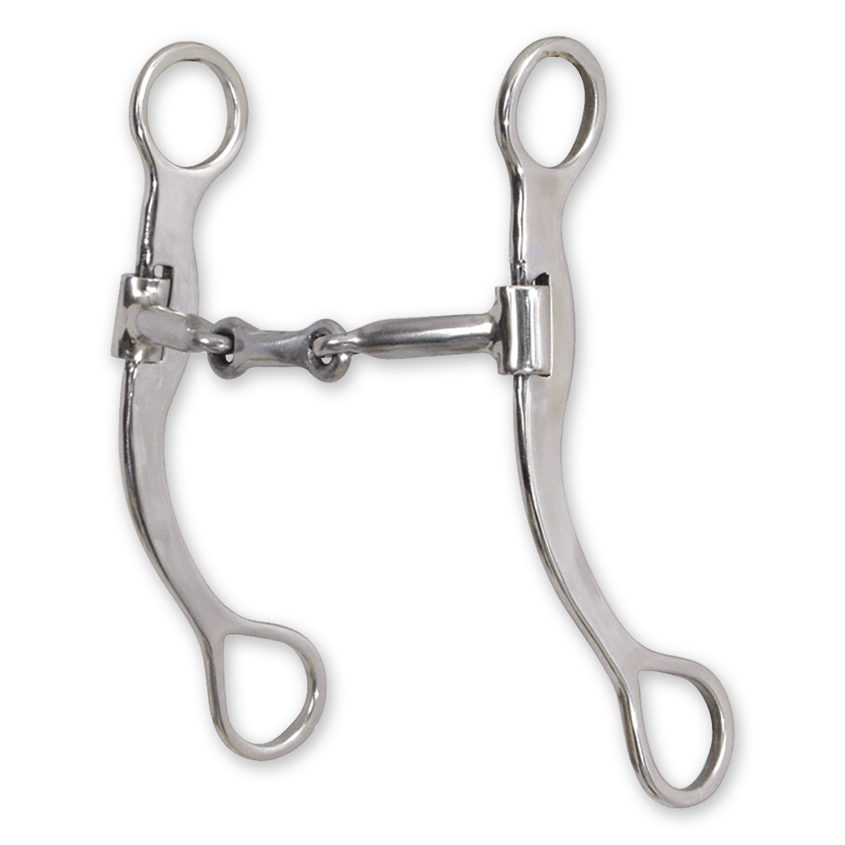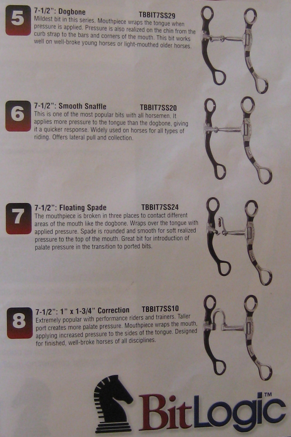 The mildest bit in the 7-1/2" cheek series, the Dogbone mouth piece wraps the tongue when pressure is applied. Pressure is also realized on the chin (due to the curb strap or chain), bars, and corners of the mouth. This bit works well on young horses just moving to a longer shank and on well-broke or light mouthed older horses. Good for lateral pull and collection and often used with a training fork or martingale. A step up in control from the dogbone, the Smooth Snaffle is one of the most popular bits with all horsemen. The snaffle applies more pressure to the tongue than the dogbone does, giving it a quicker feel and causing a more immediate response. The horse realizes pressure on the chin, bars, and corners of the mouth. Widely used on horses for all types of riding and training activities. Good for lateral pull and collection and may be used with a training fork or martingale for increased control of the poll and nose. Often seen as severe, the Floating Spade bit is fairly mild. Like the dogbone, the mouthpiece is broken in three places to contact different areas of the mouth. It wraps over the tongue with applied pressure. The top of the spade is rounded and smooth for soft realized pressure to the top of the mouth. It is a great bit to introduce a horse to palate pressure in the transition to ported bits. Pressure is also felt on the chin, bars, and corners of the mouth. It wraps over the tongue with applied pressure. the top of the spade is rounded and smooth for soft realized pressure to the top of the mouth. It is a great bit to introduce a horse to palate pressure in the transition to ported bits. Pressure is also felt on the chin, bars, and corners of the moth to contact all possible pressure points. This bit is commonly used in training and many performance events. Extremely popular with performance riders and trainers from all disciplines, the Dogbone bit is a step up from the floating spade. The taller port in the mouthpiece creates more palate pressure. The mouthpiece wraps the mouth, applying increased pressure to the sides of the tongue. The wrapping effect is also sensed by the corners of the mouth and the bars, while chin pressure results from applied pressure to the curb. Often used on finished, well-broke horses used in speed events, roping, cutting, reining, and team penning. Good for collection and stopping.