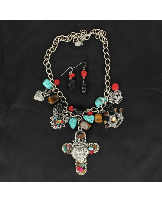 Crown, Heart, and Cross Charm Necklace and Earring Set