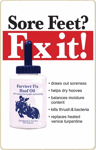 -- Sore Feet, Quarter Cracks, Laminitis, Thrush, etc.: Apply Farriers’ Fix Hoof Oil to clean and dry hoof exterior, sole and frog every day.