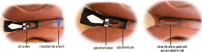 First, lay the saddle upside-down on a flat surface with the cantle facing you. Open the flap between the panels and use the t-handled hex wrench to just loosen the two set screws. Take care to simply loosen them. Don't remove the set screws.