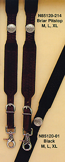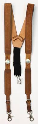 Classic leather suspenders with buffalo nickel conchos, tooling and leather basket weave.