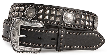 This Nocona black leather belt sports a silver-tone buckle with floral pattern and twisted rope design edging. Silver-tone studs highlight keeper and belt's edges. Two rows of square studs complement larger silver-tone conchos down center of belt. Belt measures approximately 1 1/2" wide.