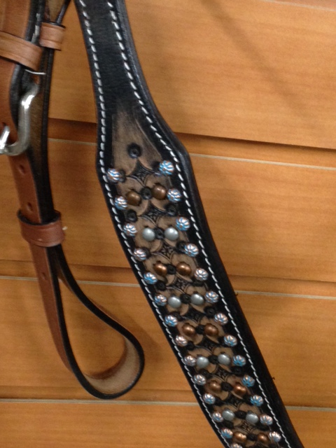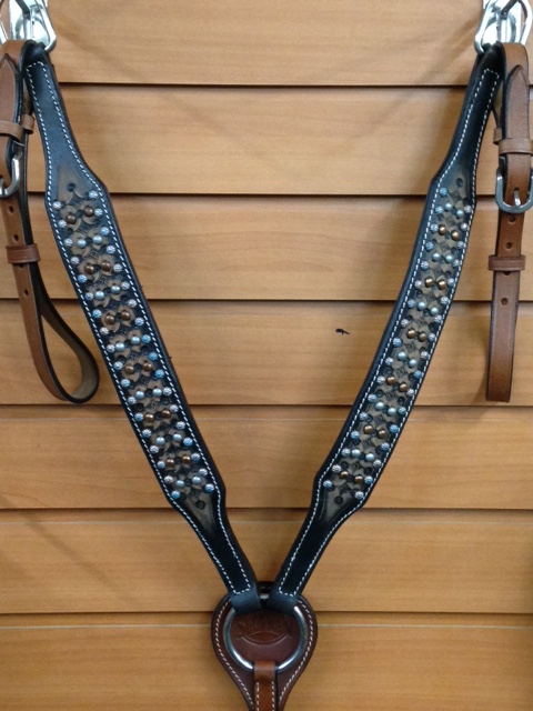 This Breast Collar features dark leather with an antique tooled design adorned with copper, silver and painted turquoise studs.