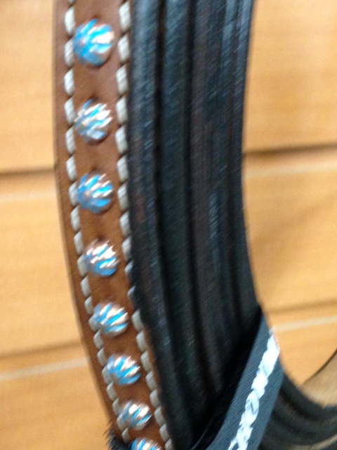 This headstall and breast collar features soft and supply dark leather with an antique tooled design adorned with copper, silver and painted turquoise studs.