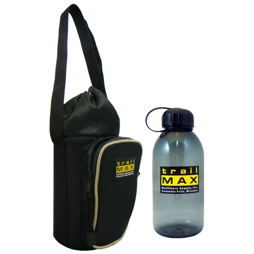 Insulated with closed cell foam with a nylon liner to allow the water bottle to easily slide in and out. Drawstring top keeps water bottle secure and protected from dirt and weather. The front pocket is a handy place to store keys, cell phone or a snack. A one-liter polycarbonate water bottle is included.