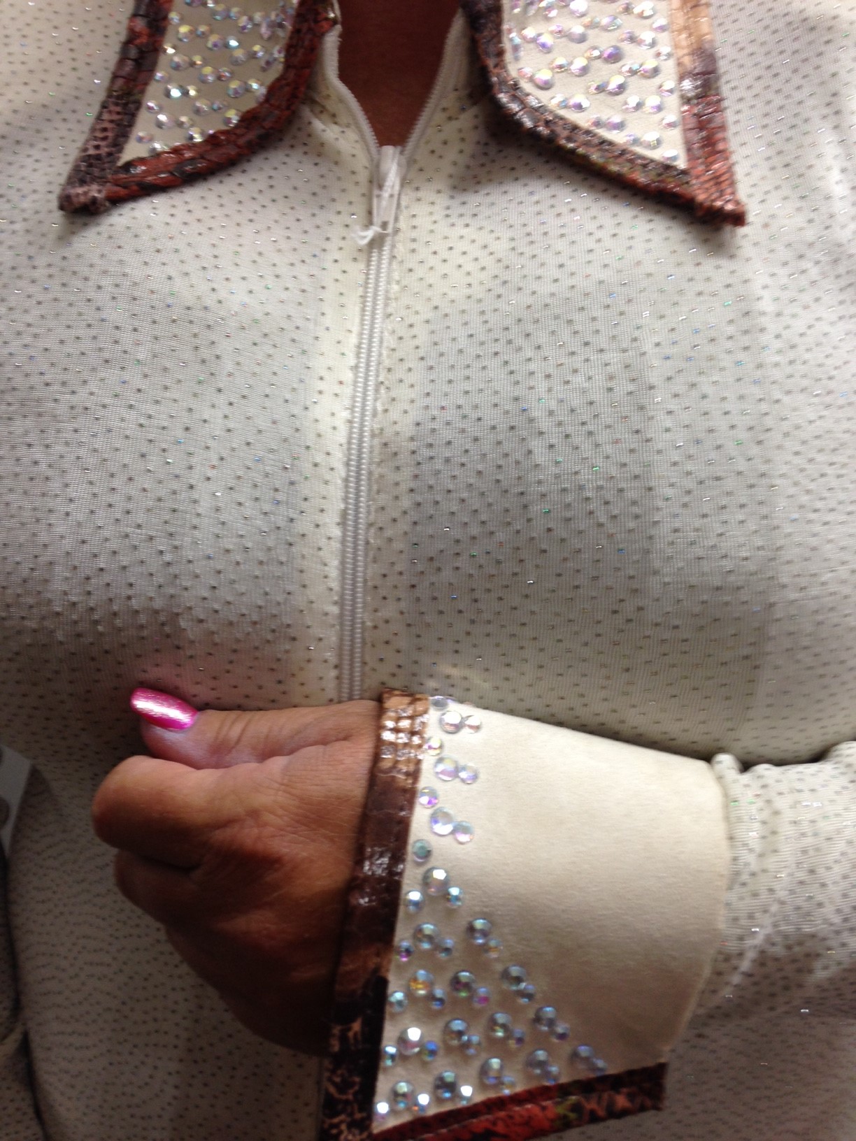 Classy all sequin front zip show shirt.