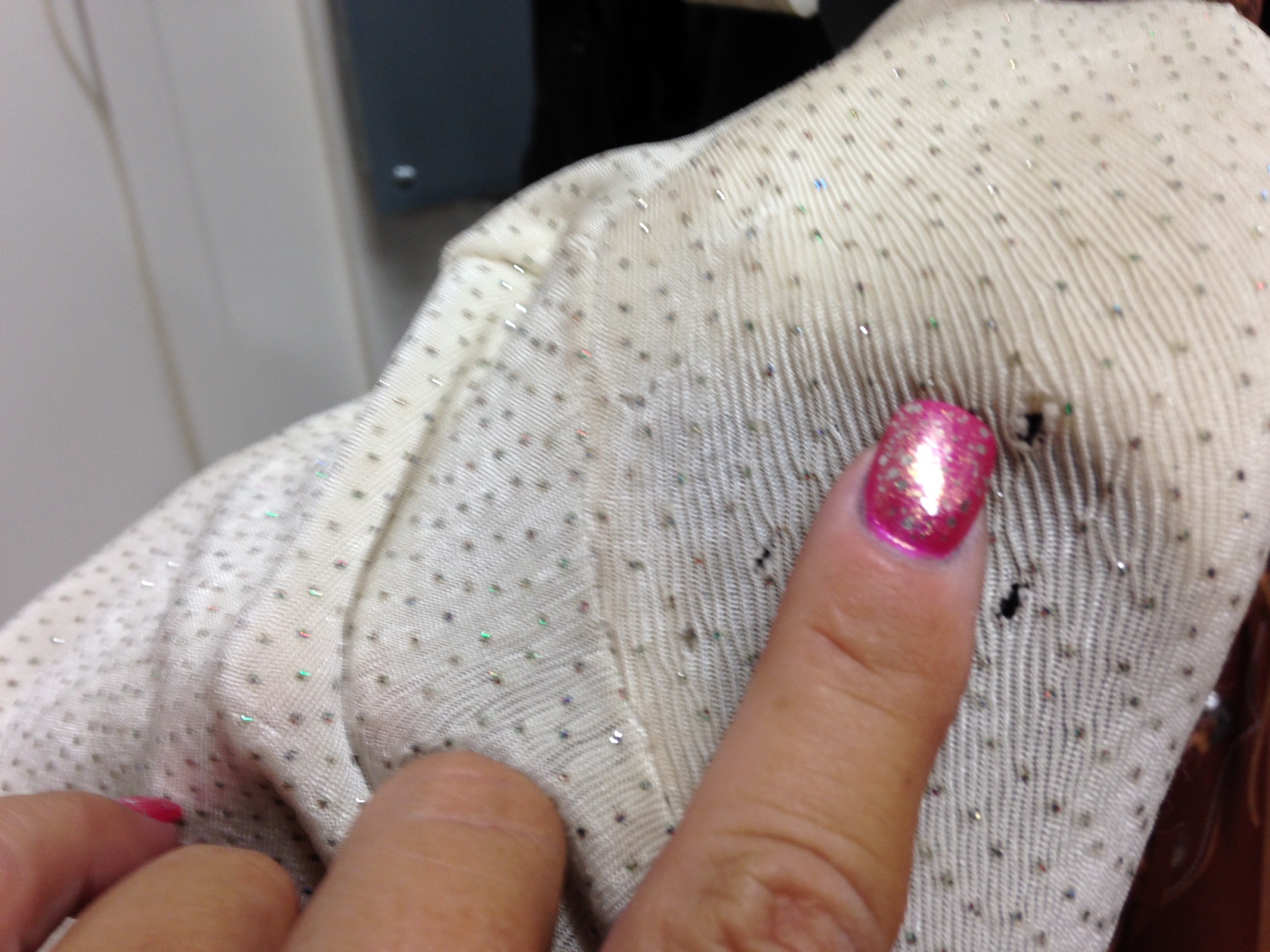 because of the shoulder pads underneath. We stretched out the hole to take a photo but they are barely visible.