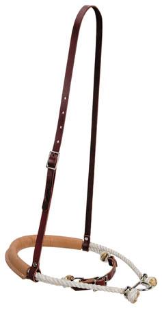 This rope noseband/caveson combo features a rope and latigo leather caveson. A latigo leather 1/2" crown strap is attached to a 3/8" nylon noseband covered in harness leather. Nickel plated buckles.