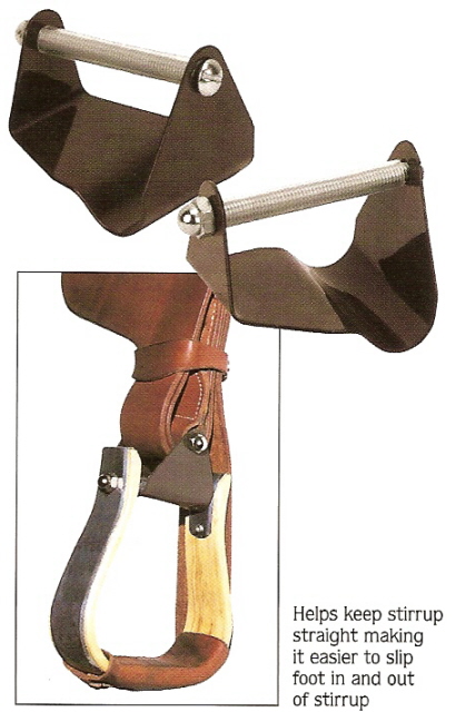 The patented design attches to stirrups and stirrup leathers to help keep stirrups straight.